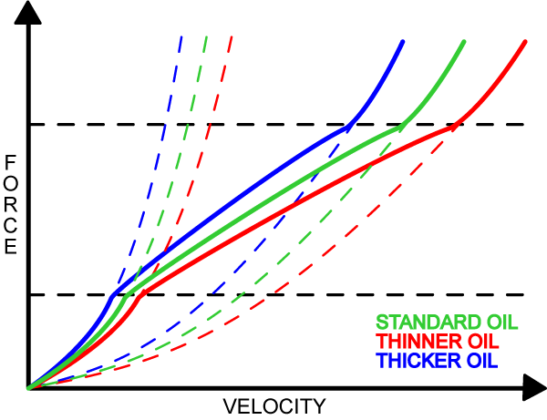 Lower viscosity oils increase the proportion and higher viscosity oils decrease the proportion of the velocity scale (Q). In other words, oil viscosity effects every part of the damping curve. Oil is very, very, very important.
