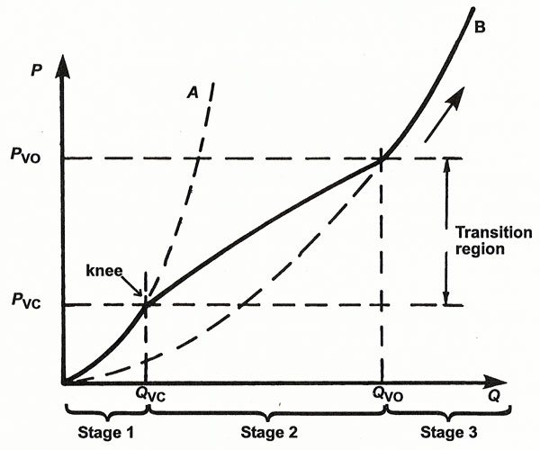 A traditional damper rod type fork would just follow Curve A, or the damping force created by oil passing through a simple slow speed orifice. Curve B, while similar in shape to Curve A, represent the damping curve created by the combination of the simple slow speed orifice and the high speed valve orifices (sans shims). With the introduction of shims over the high speed valve, the true damping is represented by the curve in BOLD. Initially, the damping follows Curve A until enough force is created to start bending the shims open. The shape of the shim stack controls initiation and the shape of the curve through the Transition Region. Once enough force has been generated to bend the shims fully open, the damping curve then follows Curve B.