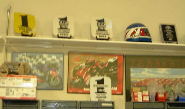 Surrounding the shop on the walls were signed pictures, awards, trophies, and the rarest of factory racing parts from days recently past. Lots of eye candy.