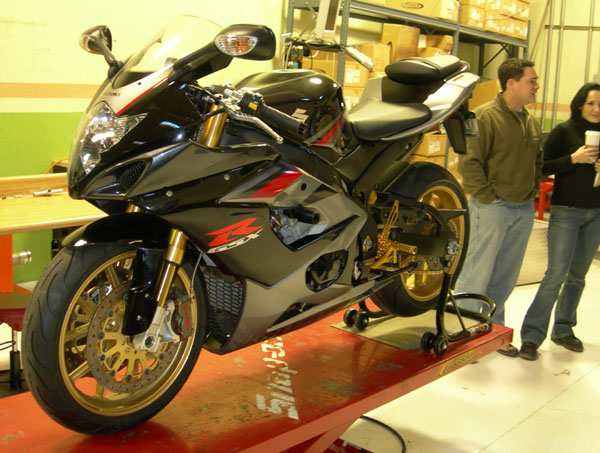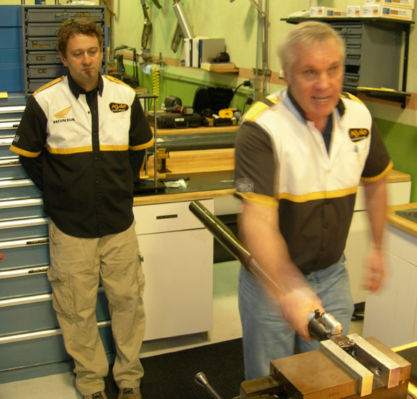 There was "super cool" stuff sprinkled all through out the day as well - the $11,000 Gas Charged Ohlins Superbike Forks had me drooling - but one of the things that I got the most out of was witnessing the difference on the dyno that a titanium spring and bearing can make on a rate graph- it all translates to what you're going to feel when out riding, that's the really great part. Joey also completely took apart an Ohlins rear shock and explained/performed a re-vavle at the same time. One of the coolest things was witnessing the installation of a cartridge kit on stock RC-51 forks. We dyno'ed them all along the way and the results just kept getting better and better. And where stock components aren't producing or aren't producing enough, Kyle Racing is manufacturing parts that work better and again the dyno proved that as well.