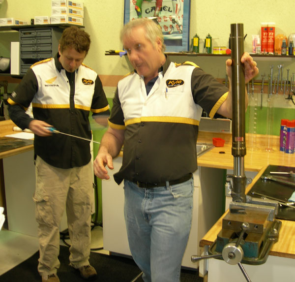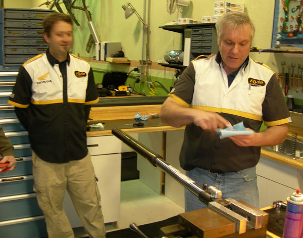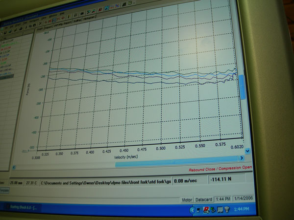 The lecture started at the beginning, springs. We discussed everything about them and dynoed several steel and Ti springs. We then talked at length about damping. We pulled a set of forks and shock apart. We then put them together with Dan and Joey explaining the "secrets" to making them work better. We ran a few different forks on the dyno showing problems and the results of changes.