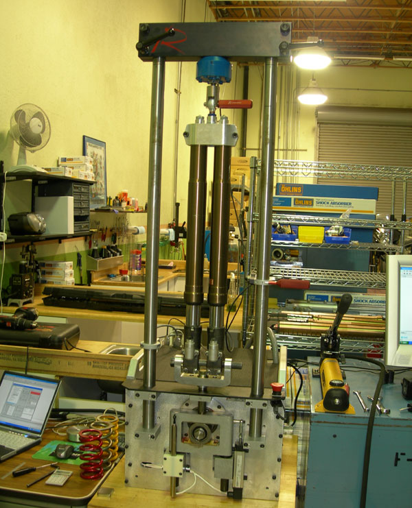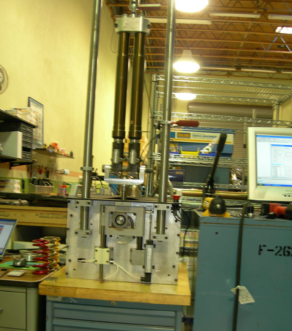 The shock dyno with a spring in it. Spring testing is job #1. All of the shock springs coming out of Dans shop have been dyno'd. the crappy ones are shipped back to Ohlins.