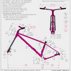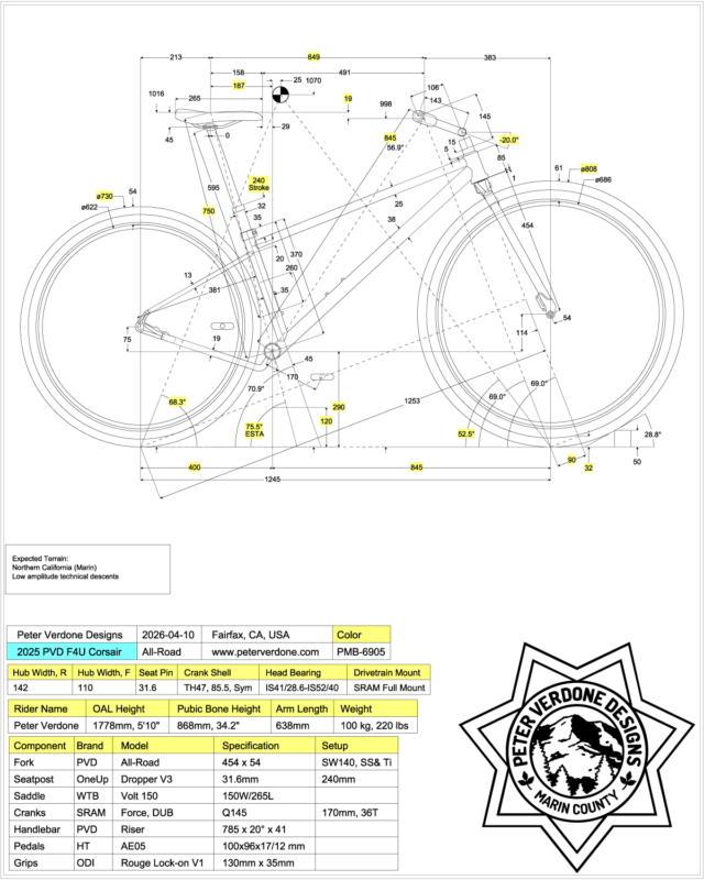 The Corsair AR is a further development on my all-road platform. A narrow gauge (Q145) format replacing the 2023 M2-F2, the Corsair moves many improvements forward. The big one, a 32″ (686BSD) front wheel option and 29″ (622BSD) options for both 100mm travel and rigid forks. These three front ends producing the same fundamental geometry within the bike. This will provide the most discrete testing of the large front wheel against traditional options.
