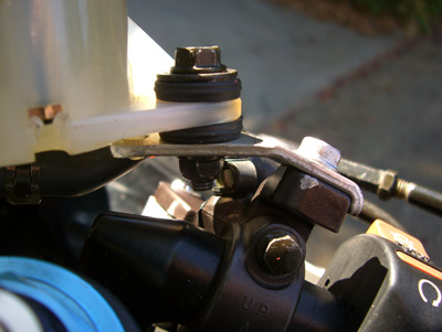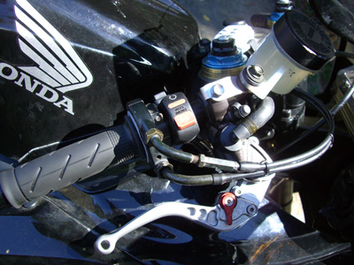 The CBR1000RR has a brake system virtually identical to the '05 CBR600RR with one glaring exception, the master cylinder. While the master cylinder on the 1000RR is of the new 'radial' configuration, the 600RR retains the longitudinal layout of the past. This was surely done in an effort to keep the costs of the 600 down. The part inventory needed to get the radial master onto the 600 (without lever) is: MASTER CYLINDER SUB-ASSY., FR. #45510-MEL-006. Crossover parts from the 600RR are BOLT, HANDLE LEVER #90114-MCF-006 and NUT, CAP (6MM) #90201-415-000 and two BOLT, FLANGE (6X22) #90101-MBZ-G00. I don't really need the lever since I'm going to be attaching my CRG lever to the unit. All I need to do is order up the CRG lever (RN-521).