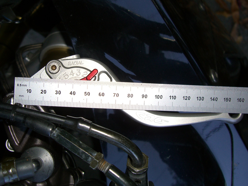 The only thing that really changed is the fluid and the master and no noticable difference in performance. As you can see from the images below, the new lever to pivot length is 155mm. With the stock master and CRG shorty lever, the length was about 145mm. A 14% increase in length! Very nice. BUT, the difference is not that noticeable in normal riding. The brakes worked great to start. Now they work...great.