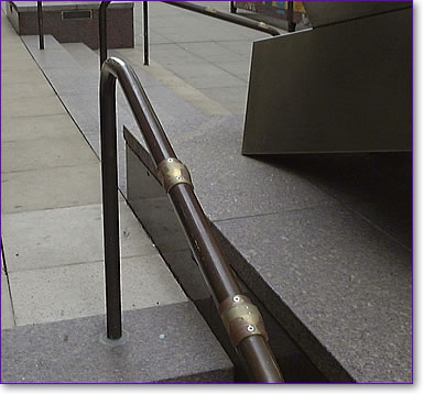 Back when i was doing most of my street skating, in the mid to late eighties, we could skate just about anywhere and have fun on the street. Today things are different. Archtects and building managers are wise to us and have figured out a way to stop skaters. They bolt or weld blocks onto ledges and rails to keep skaters off. Sucks huh?