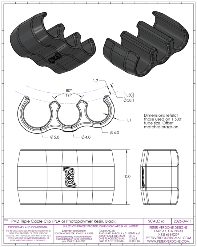 Several rounds of prototypes led to what you see now. A fairly clean and elegant clip. The center axis of each line is matched to the braze-on so that it is as straight as possible along the run.