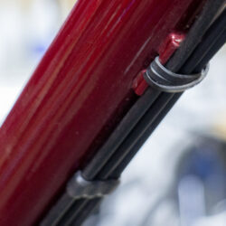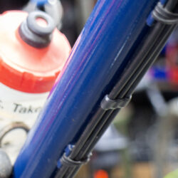 From this, the underside of the down tube becomes a crowded space. Two cables and a hose run along the length of it. My braze-ons hold them fast at four points and as close to the tube as can be allowed. This works well. Still, in the spaces between the braze-ons, the lines can wander slightly creating clutter when closely examined.
