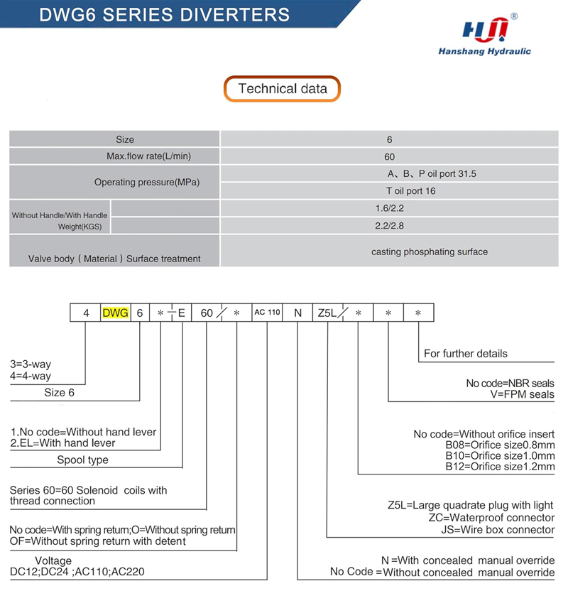 Hydraulic Valve Directional Control Electric Solenoid, 3-Position, 4-Ports, 2-Pin, 4-Way (D03, NG6, Size 6, AC 110V), Hanshang Hydraulic
