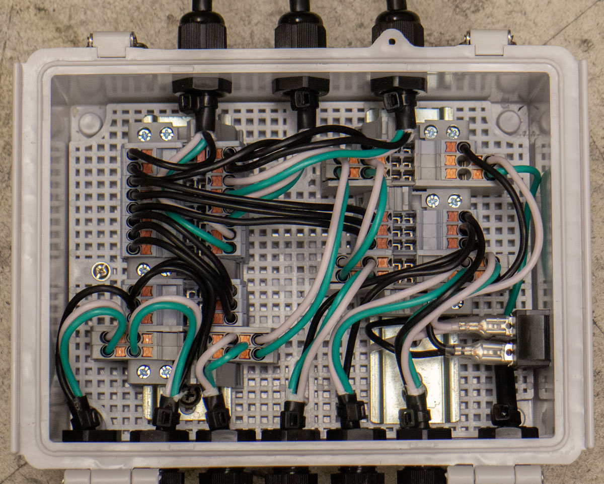 I had initially attempted to wire the system using 14/4 SJOOW cord and similarly sized ferrules. This to theoretically match the strain relief diameter of the coil plug, optional pendant wiring, and have a nice heavy wire gauge for excessive amperage in the line. The specification for the 2.5mm terminal blocks said 14AWG wire was usable. The crimping had been done with a hex crimp. This proved to be highly problematic. While the crimped end fit into the terminal blocks fine, the wire locking system failed to function, so the wire would pull out easily. I tried a trapezoidal crimp to help the wire locking but that didn’t help. More, the OD of the wire sheath was slightly oversized making strain relief routing and wiring the DIN plugs challenging. Eventually, I switched to a 16/3 SJTW cord and a trapezoidal crimp which fixed all the retention issues. The 8.3mm OD worked much nicer with the strain reliefs. While the terminal blocks are supposedly rated for 14AWG, I’m going to consider 16AWG the maximum wire to use for the screwless terminal block systems.