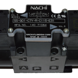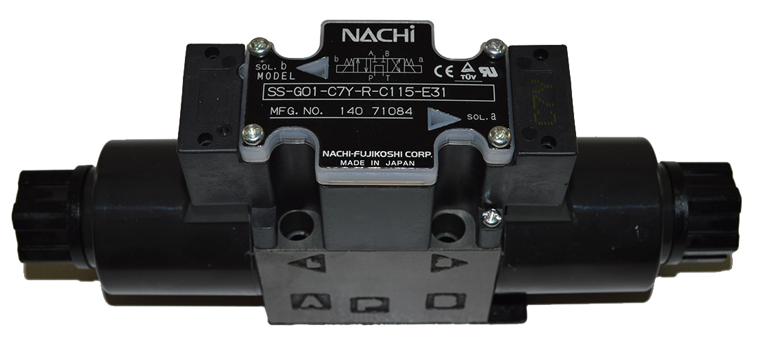 A fairly nice Japanese directional control valve was in place. A Nachi Hydraulics SS-G01-C7Y-R-C115-E31. The problem was the spool. Note that when the valve is inactive, pump diverts directly to tank. That makes this valve useless in a system where other circuits are used from the same source as there would be no pressure in the common lines.