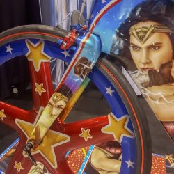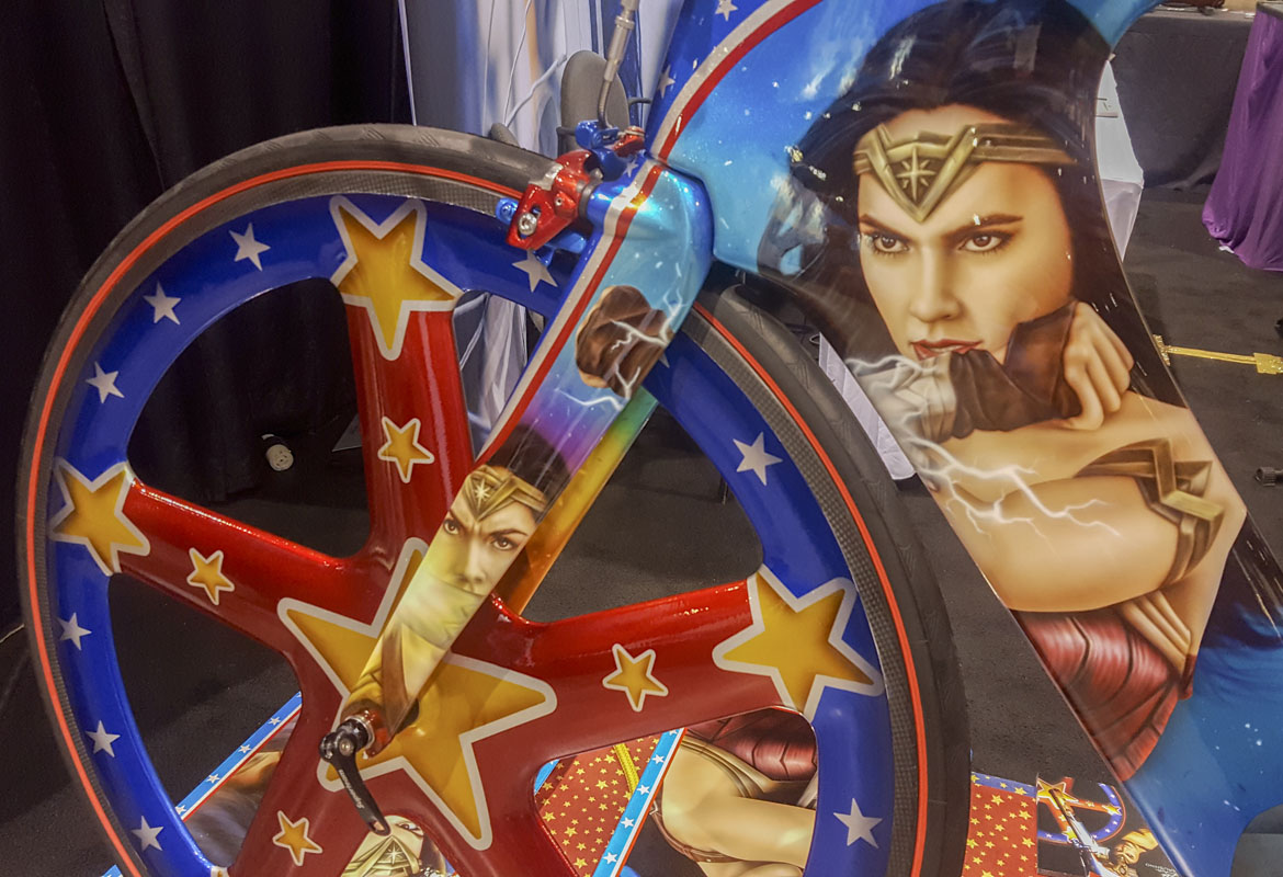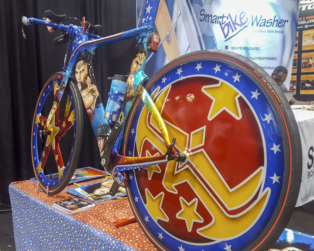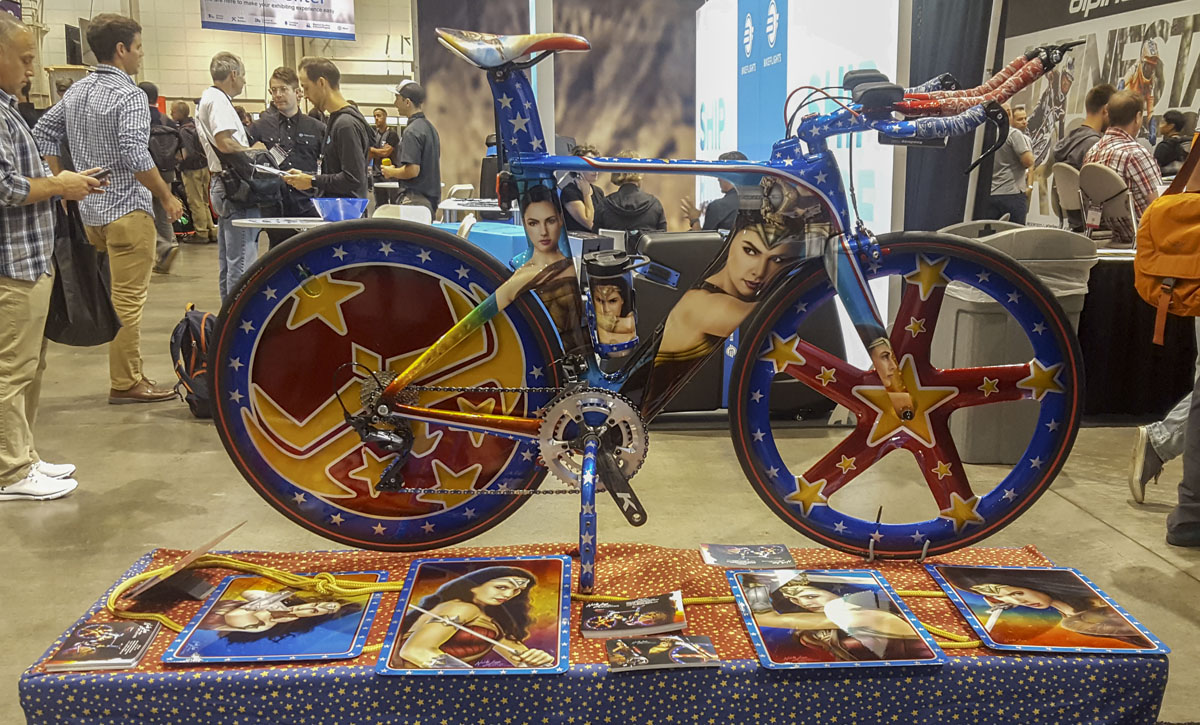 Some bikes can stop a whole show. At Interbike 2018, the annual US bicycle trade show, that’s exactly what this one did. Over and over you’d hear, “Did you see the Wonder Woman bike?”, “Did you…?” No other bike got more attention.